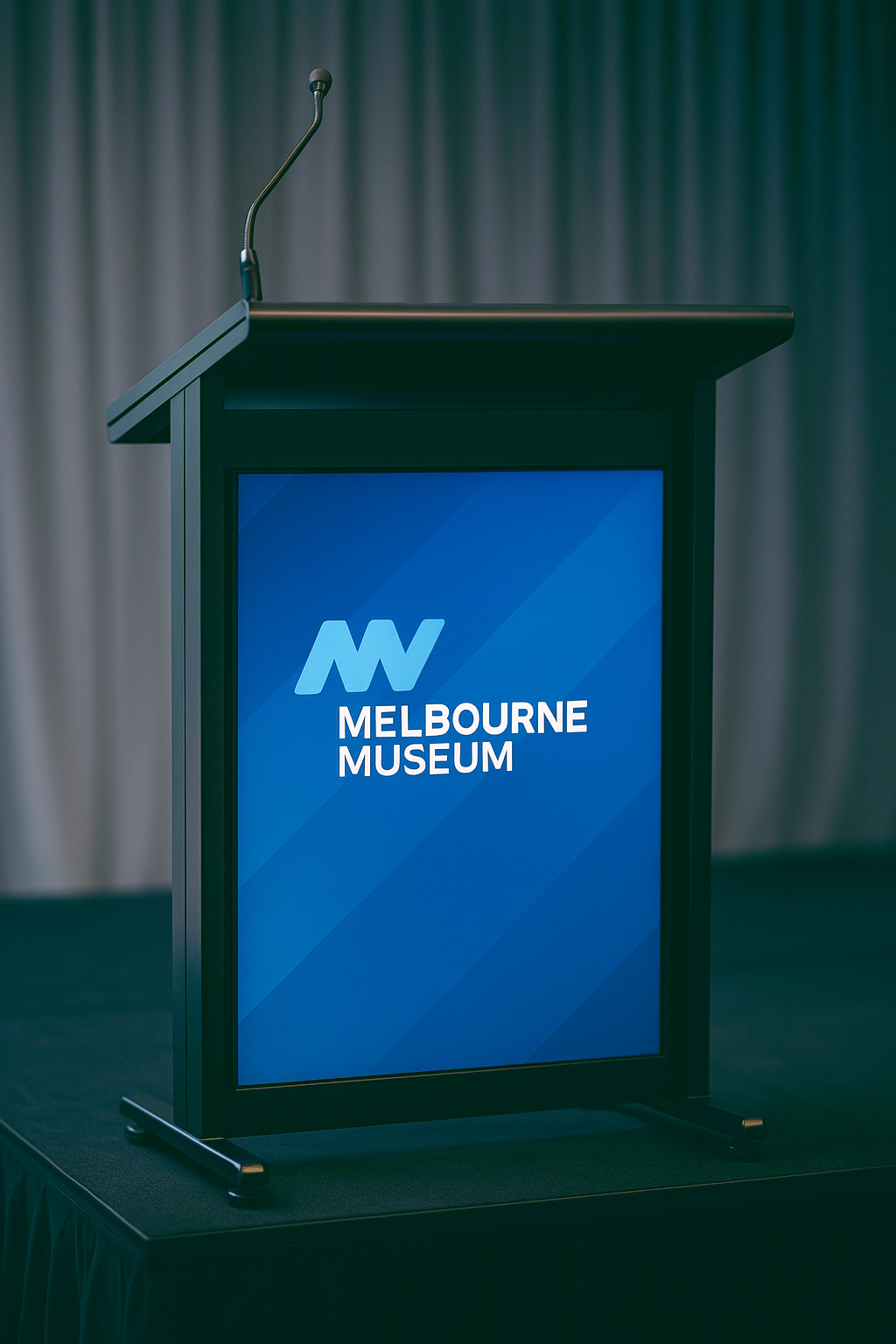 Designed to cover the full face of Classic Series lecterns, this full dress panel logo provides a sleek, professional backdrop for your logo or company name. The 2mm precision-cut panel is easily attached and removed thanks to the integrated Velcro system, offering a practical and reusable branding solution ideal for events, conferences, or multi-purpose venues where flexibility and visual impact are key.